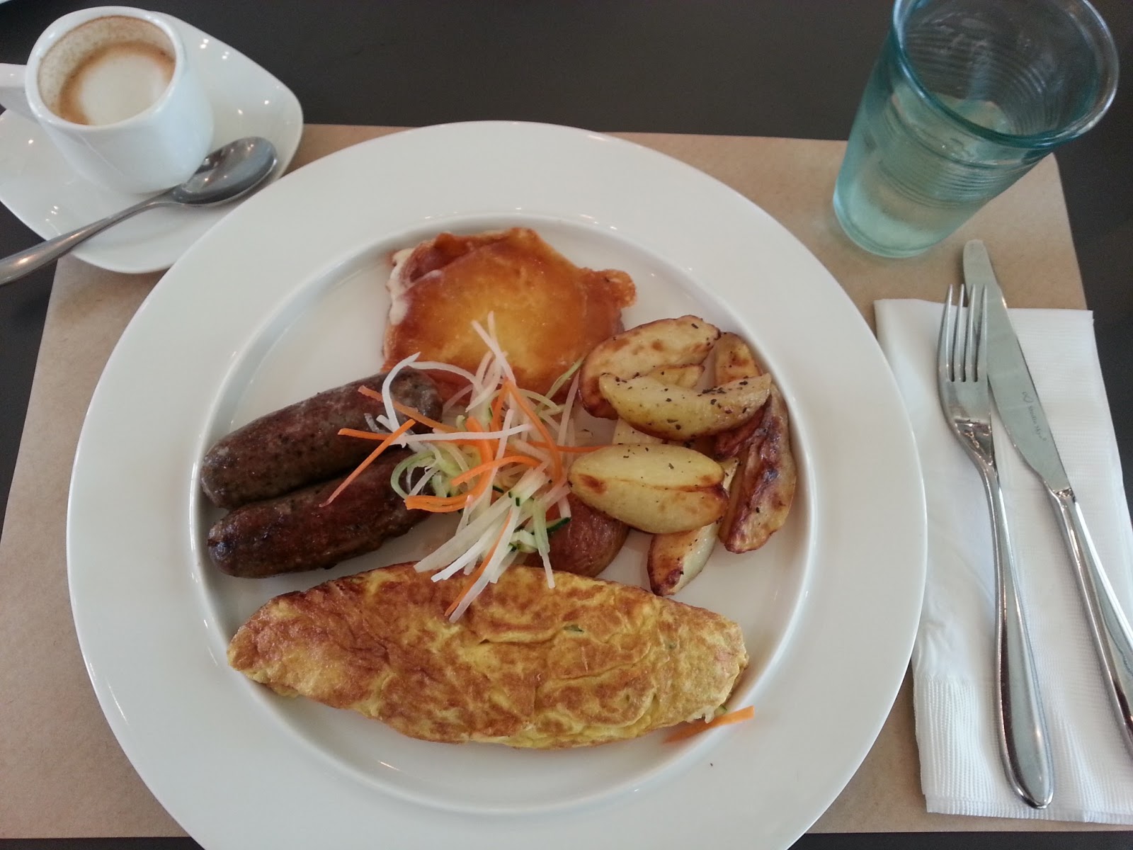 my vegetable omelette with a mozzarella pancake, lamb sausges and fried potato wedges. Those sausages were abit too oily for me but I otherwise love the entire meal.